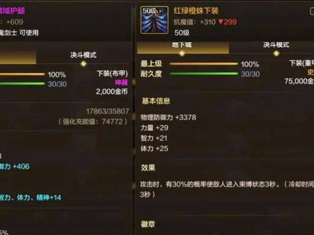 2.红绿橙蛛下装:力量智力加成也就那样。效果是30%概率让敌人进入束缚状态3秒。同样,看着没啥用。