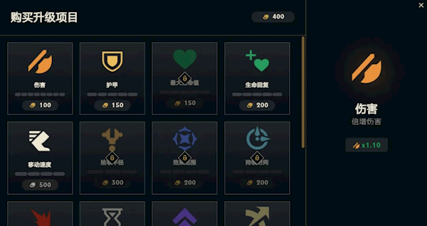 玩家可以花费金币升级的属性有伤害、护甲、最大生命值、生命回复、移动速度等。