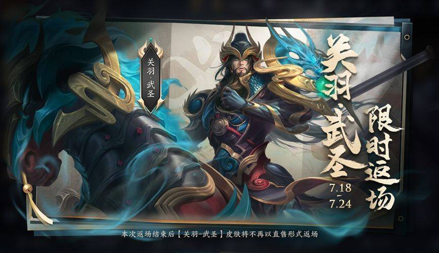与此同时,另一位历史名将关羽也将披上他的经典战袍——“武圣”皮肤,再度驰骋于王者峡谷之中。这款曾让无数玩家为之疯狂的限定皮肤,承载着关羽勇猛无畏的精神与传说中的武圣风采。如今,它限时返场的消息无疑将点燃玩家心中的热情,让每一位渴望荣耀的勇士都能亲身体验关羽横扫千军的豪迈气概。