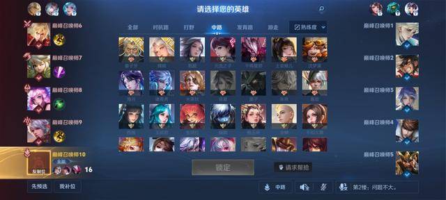这局补位中路,我方阵容跟案例二一样,啥都缺,这局依然可以补甄姬,但是考虑到对面有一个对抗路的海诺,选甄姬我方阵容处理不掉他。同时我方阵容选甄姬出来前期有点弱,所以选一个克制海诺的安琪拉。