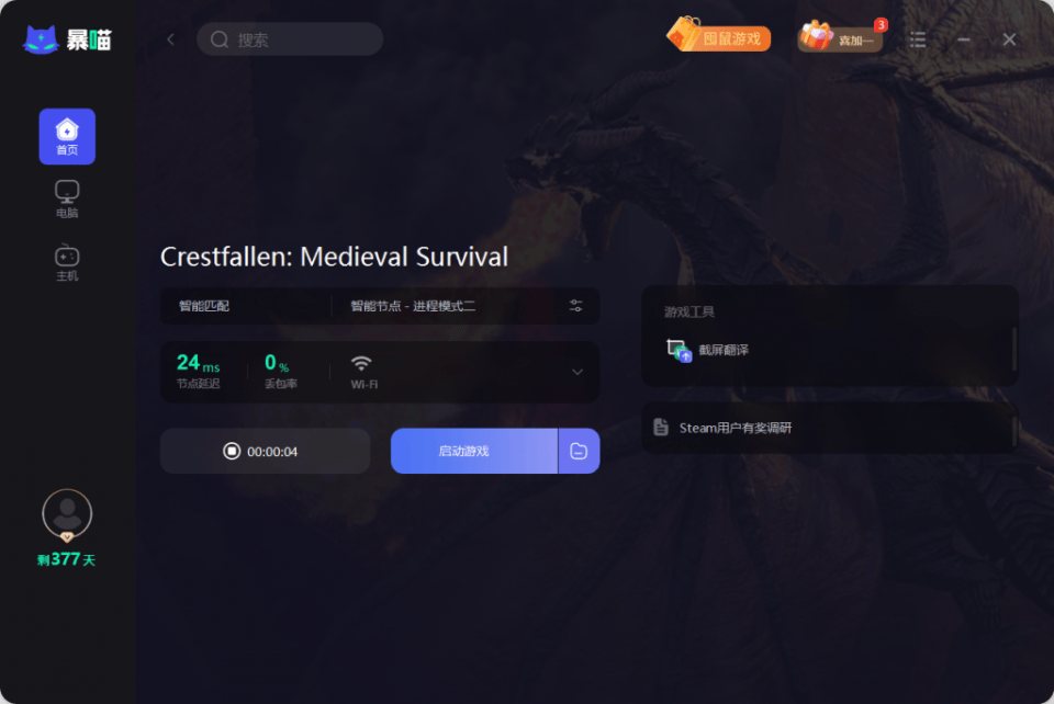 Crestfallen: Medieval Survival游 戏不支持中文,并且支持多人联机游 戏,可下载使用baomiao加速,点击加速界面上的截屏翻译,进入游 戏后选择要翻译的地方进行翻译即可。