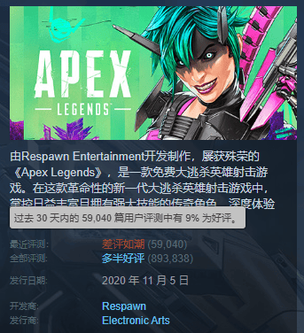 截止目前,《Apex英雄》在Steam上的近期好评率已经跌到了9%,短时间内出现了5万多篇差评,成为了今年游戏圈最严重的差评轰炸之一。