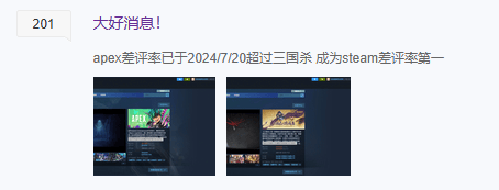 这两天,已经运营了5年的《Apex英雄》迎来了重要的历史时刻,各大玩家社区都格外热闹,大家奔走相告:我们玩的游戏超过《三国杀》,登上Steam差评榜第一了!