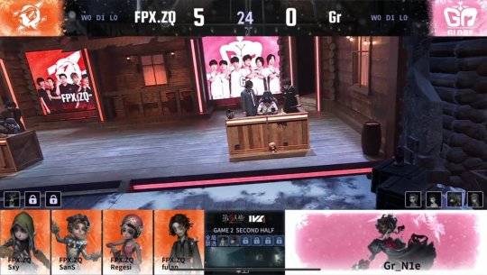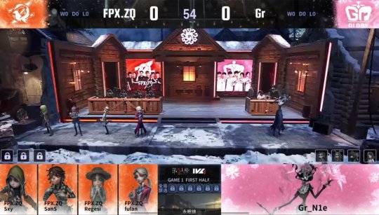 FPX.ZQ的求生者选择了佣兵、杂技演员、入殓师、“心理学家”(BAN时空之影、歌剧演员);Gr的监管者N1e选择了隐士。(BAN先知、勘探员、空军、机械师)