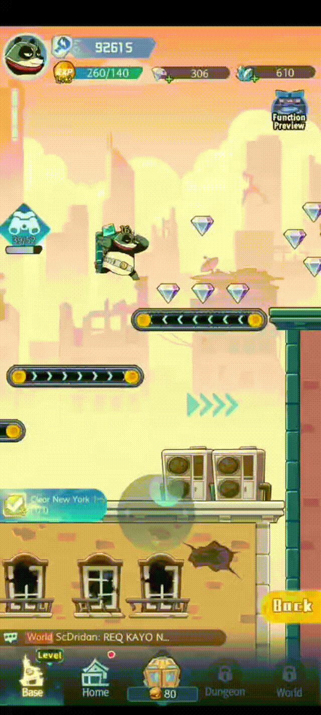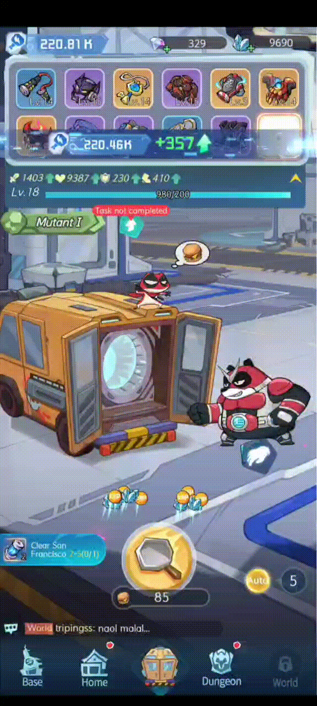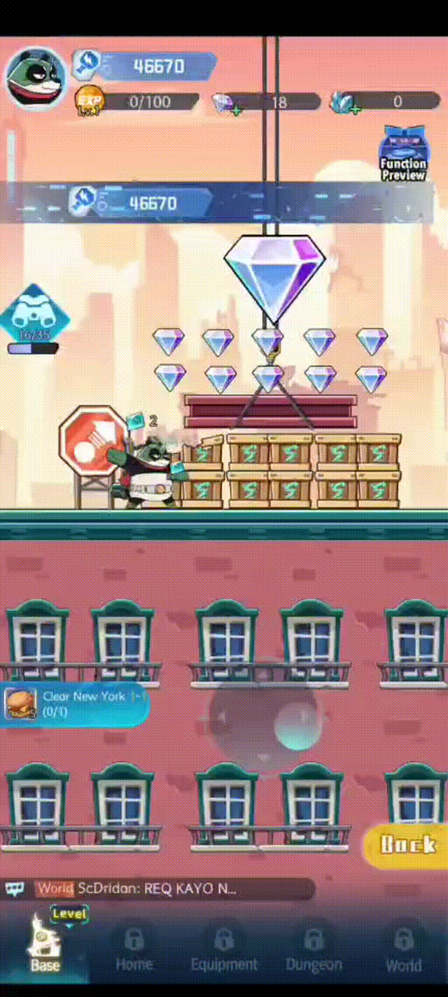 关卡设置成了类超级玛丽的形式,有弹簧、神秘盒、钥匙解锁的房间、隐藏房间等各种趣味元素,玩家操控角色主要收集基地升级材料、钻石、汉堡(开箱子的必备物品)。一旦进入战斗,就会切换成自动攻击的回合制模式。