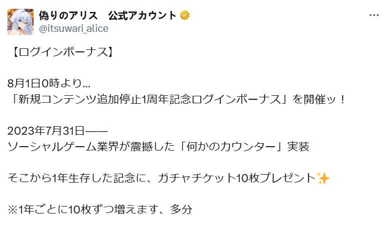 为了不让游戏彻底停服,一批又一批的新玩家开始了《虚伪爱丽丝》的旅途。大家的消费热情并没有随着时间的推移而流逝,每个月近200万日元的服务器运营费用通常都会在10号左右顺利达成,如果玩家们氪金太过积极,官方甚至还会发文劝大家量力而行。