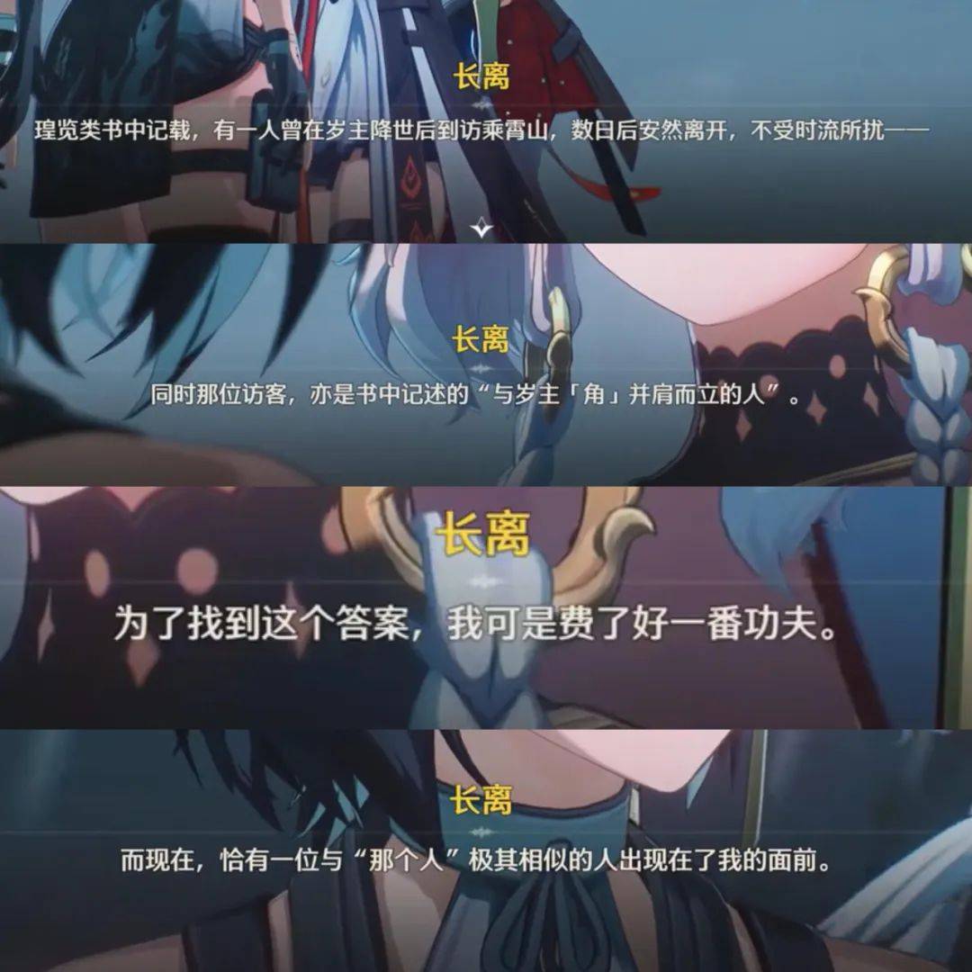 这一段虽然总共不过8分钟,但依然透露出了相当多信息,比如玩家似乎就是曾与“角”并肩而立、不受乘霄山时序乱流影响的“传说之人”,而长离本人也一直在为找寻这个史书中记载的人物劳心伤神。