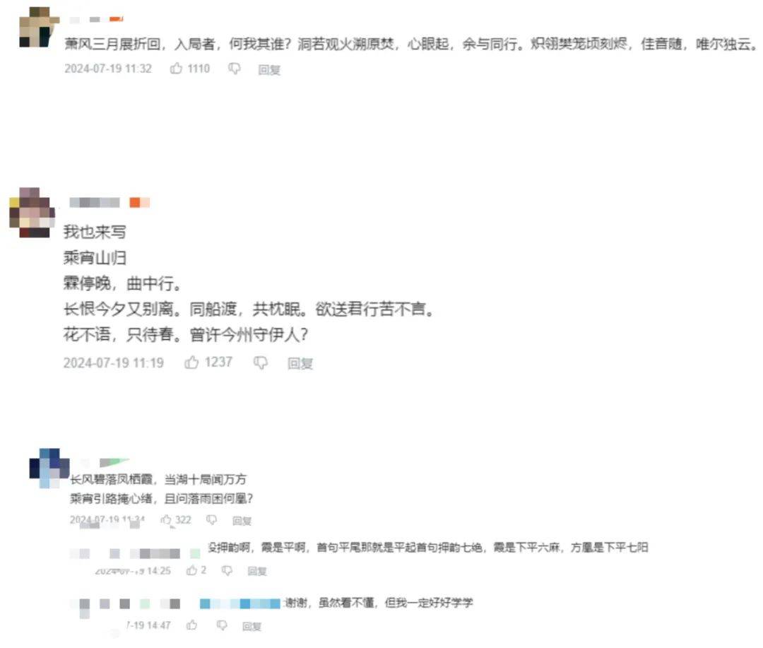 所以,从文化属性上,长离包括今汐的角色设计天生就更具文化亲和力,容易被大中华文化圈层接受,因而长离自然也成为了玩家充分发挥诗词天赋的绝佳对象,在《鸣潮》7月19日PV下,我们就能看见不少“文豪”出没,甚至一些玩家还探讨起了平仄。