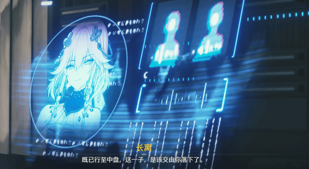 长离最初出现在1.0主线任务“庭际刀刃鸣”结尾,那时玩家刚与今汐初见,挫败敌人阴谋,确认下一阶段行动目标之后,长离以今汐师傅的身份仅仅露了个通话界面的头像。不过从她与今汐的对话中,我们得知,长离是主角整个1.0行动的“操盘手”,所以长离给玩家留下的第一印象是“位居幕后的策士”,这一初印象也成为了库洛塑造长离的底色。