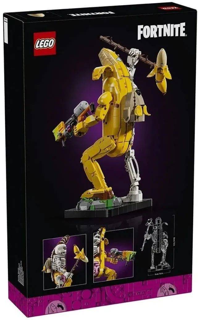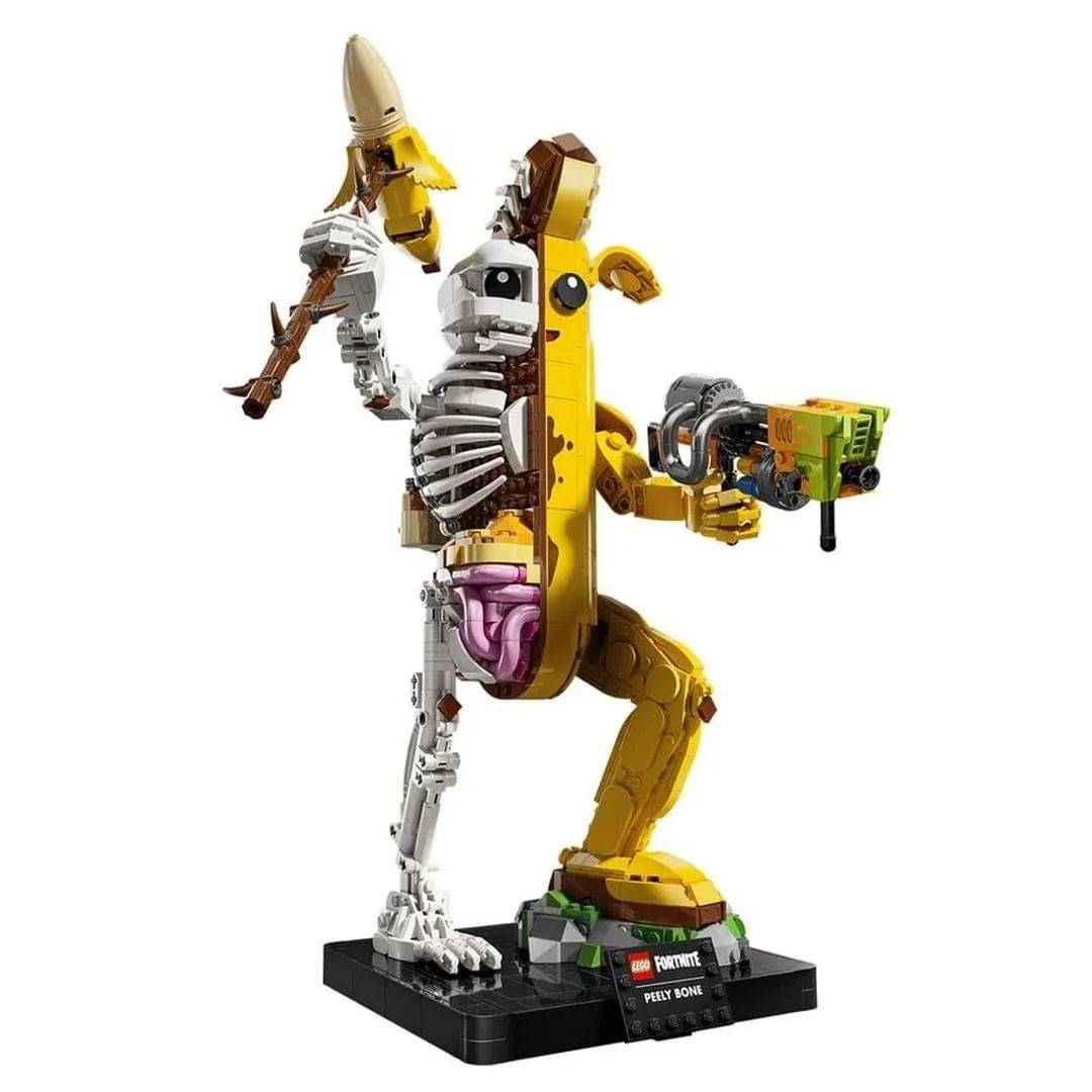 这个半香蕉半骷髅造型的半解剖拼搭人偶名字叫做Peely Bone,它是《乐高堡垒之夜》游戏中香蕉人的一个特殊皮肤。Peely Bone首次出现在2019年的庆祝万圣节“噩梦之夜”活动中。这种一半香蕉人Peely,一半骷髅的混合体的设计使得Peely Bone看起来既搞笑又有点恐怖,非常适合万圣节主题。
