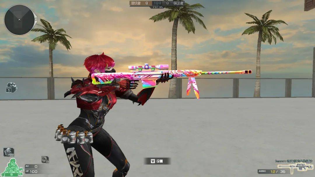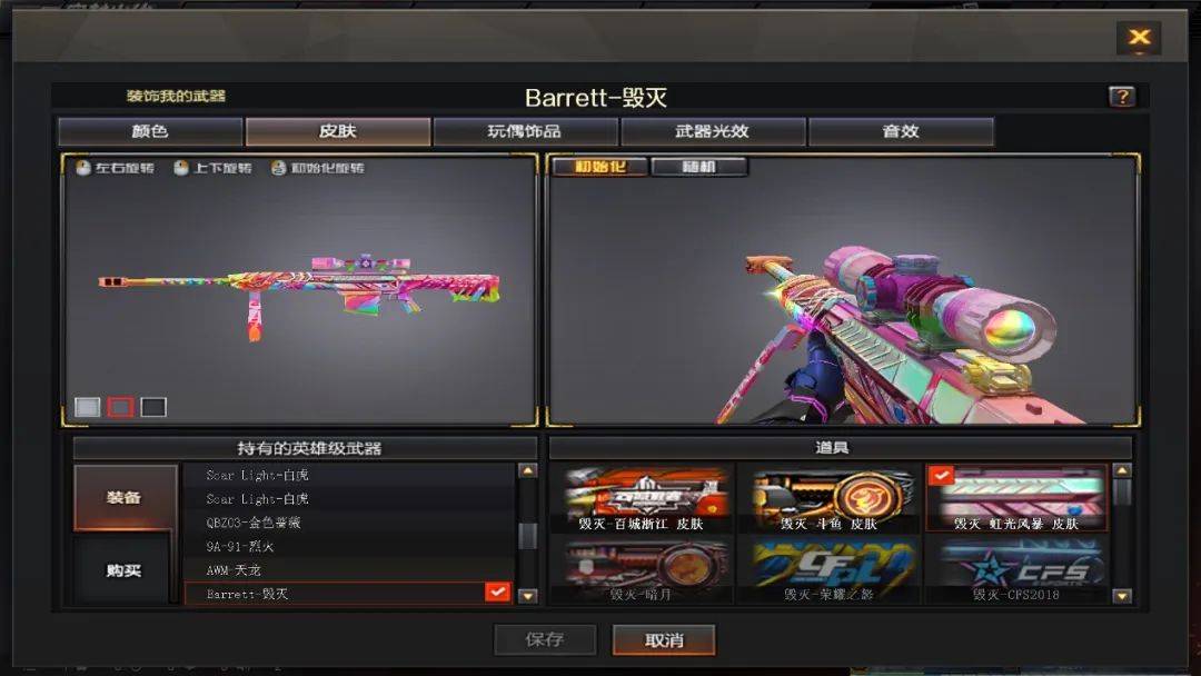 而从第三人称视角来观赏“虹光风暴”皮肤效果的话,又会觉得这款“毁灭”皮肤极具“少女心”,甚至在一些枪管和瞄准镜的细节之处上还点缀着不同颜色的卡通图案。