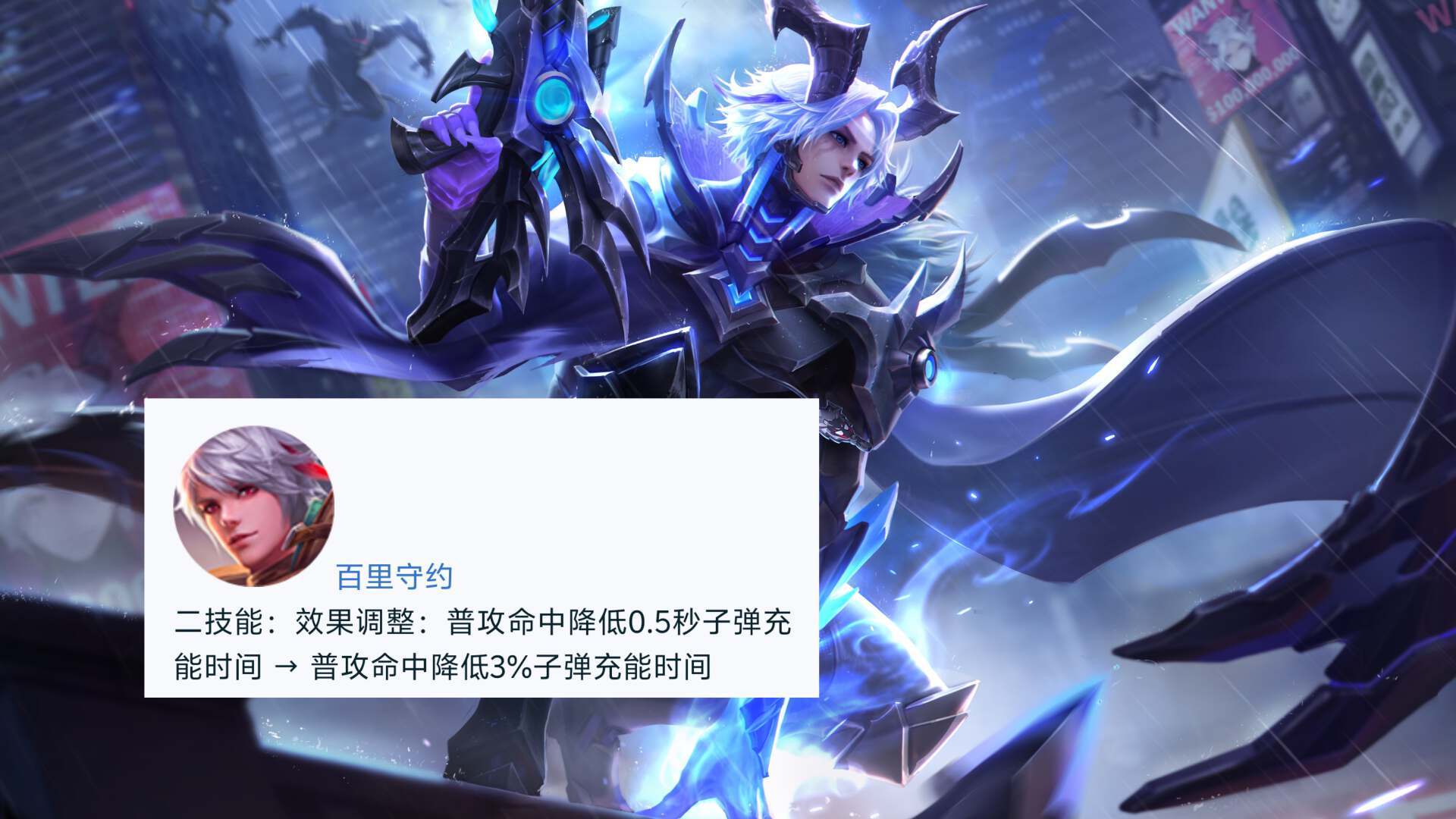 百里守约则是削弱了二技能子弹充能效果,之前普攻命中会减少二技能0.5秒冷却时间,而现在改成了降低3%子弹充能时间。这个技能满级的充能时间是12秒,百分之三也就是0.36秒冷却。