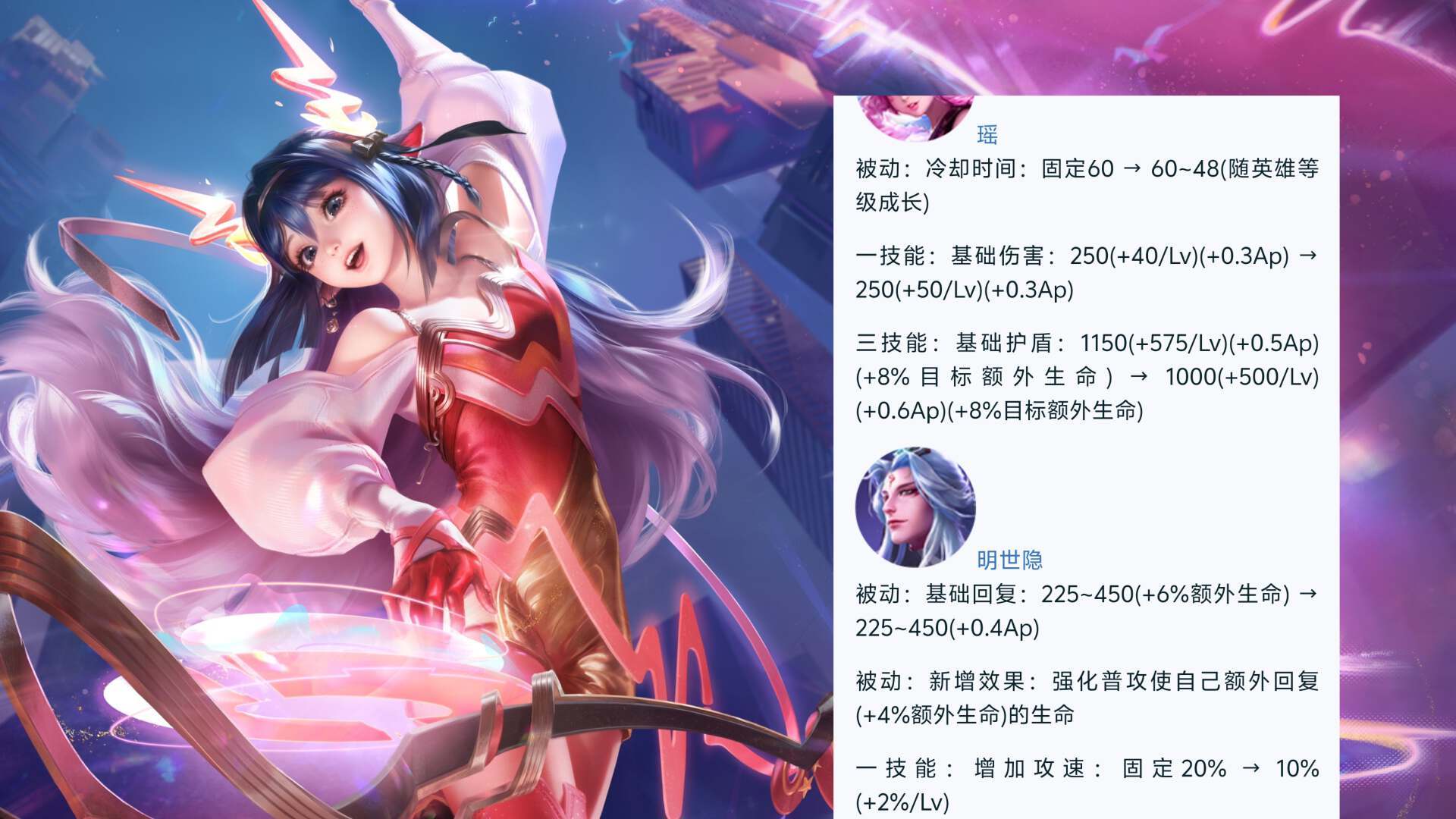 最后就是瑶和明世隐这两个的调整了,瑶被动冷却时间后期降低,一技能基础伤害提高,但是三技能的护盾基础数值下降,满级降低了300点,虽然提高了0.1AP加成,但是很明显无法弥补这300点护盾。
