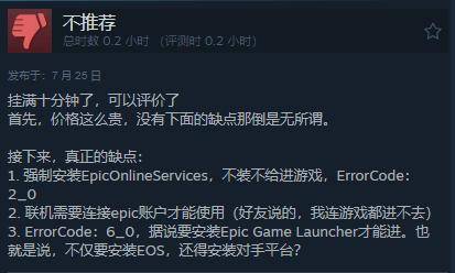 值得一提的是,本作目前Steam评价为“多半差评”,其原因主要为在Steam平台游玩联机模式时,游戏会强制要求玩家关联Epic账号。此外,评论区还提出了游戏强行锁60帧,DLC价格过高等问题。