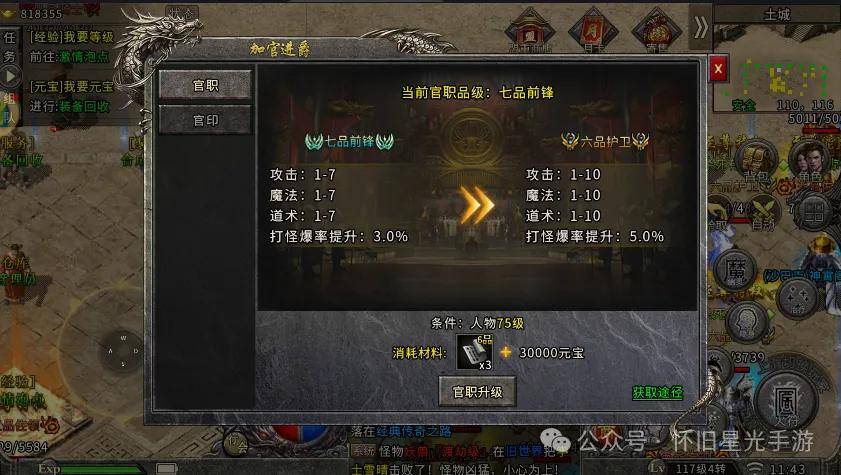 官职系统:除了实力,地位同样重要。官职升级需要元宝支持,但带来的攻击加成和爆率提升,绝对是物超所值。更重要的是,那霸气侧漏的官职称号,让你在人群中脱颖而出!