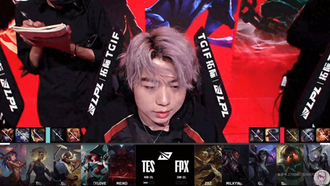 Jackeylove和Meiko的双人组对线FPX的韩援双人组,前期优势太大,10分钟是击杀和防御塔一起拿。由于下路崩盘太早,FPX这局选出来没怎么受到版本削弱影响的皎月打野,也是基本上没什么作用。