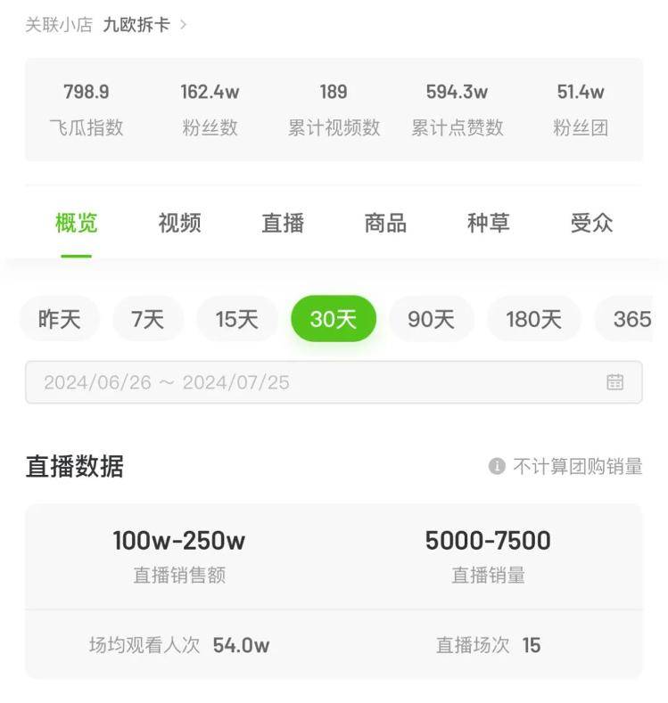 实际上,拆卡直播间的人气表现、直播间销售额上都有着不错的表现。据飞爪数据,以抖音高人气直播间九欧拆卡为例,近30天内,九欧拆卡累计直播15场,直播销售额100万-250万元。