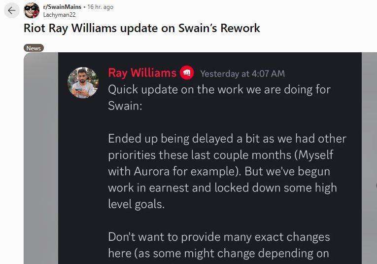 英雄联盟在2024年放慢了新英雄的发布速度,截止于阿萝拉,今年只发布了2个新英雄,而年底只剩下1个安蓓萨。但设计师则是加强了对老英雄的重做,这里说的“重做”不是斯卡纳那种大型VGU更新,而是针对现有游戏玩法的中型重做。7月28日,设计师Riot Ray Williams宣布了斯维因的最新消息,他们将对英雄“乌鸦”斯维因进行改动。