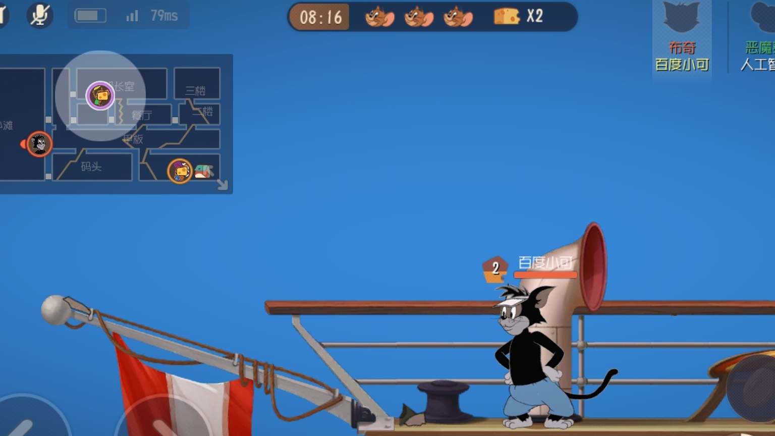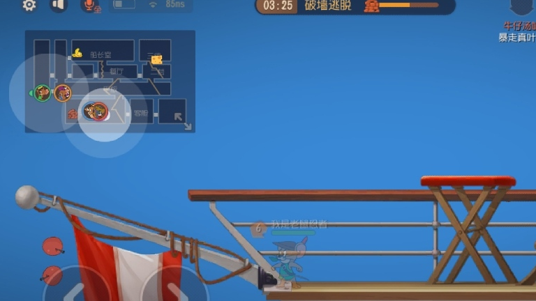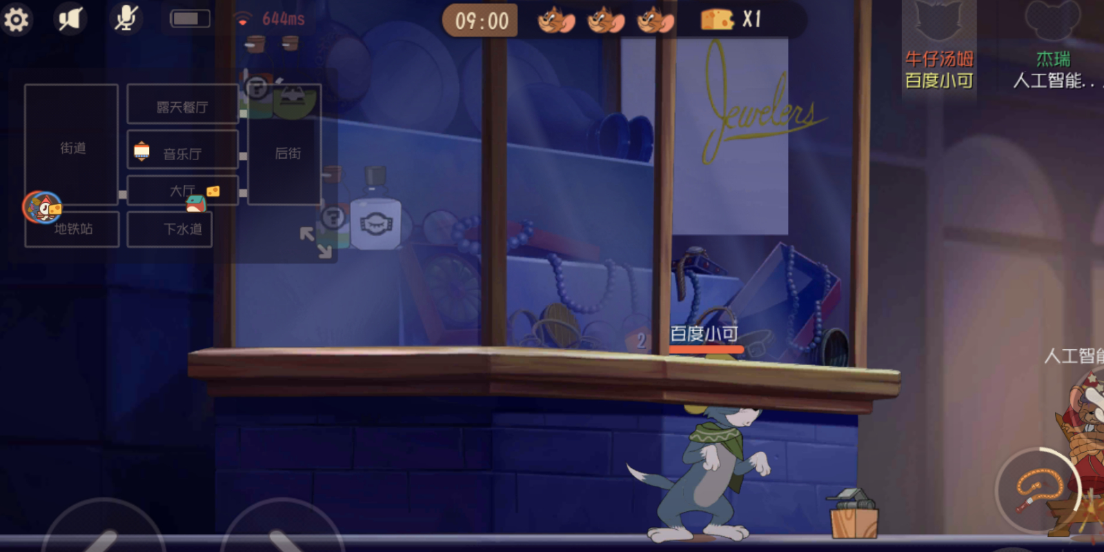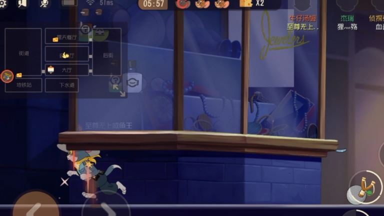 在大都会一图,有个能卡住猫咪的点位,相信有些小伙伴早都知道了,就在地图左侧橱窗的下面,老鼠在这里来去自由,但猫咪想要从橱窗下面通过,就会出现卡住进不去的现象,或许是模型的原因吧(猫咪的确是比老鼠高大许多)?但只要猫咪玩家往返重复几次动作,也是能进入橱窗的下面,如上图所示,当猫咪进去后,只能看到一半猫头,进去后只能左右走,无法上下跳跃,如果入口处被鼠方玩家封上了叉子,那么猫咪就会被“养猪”。