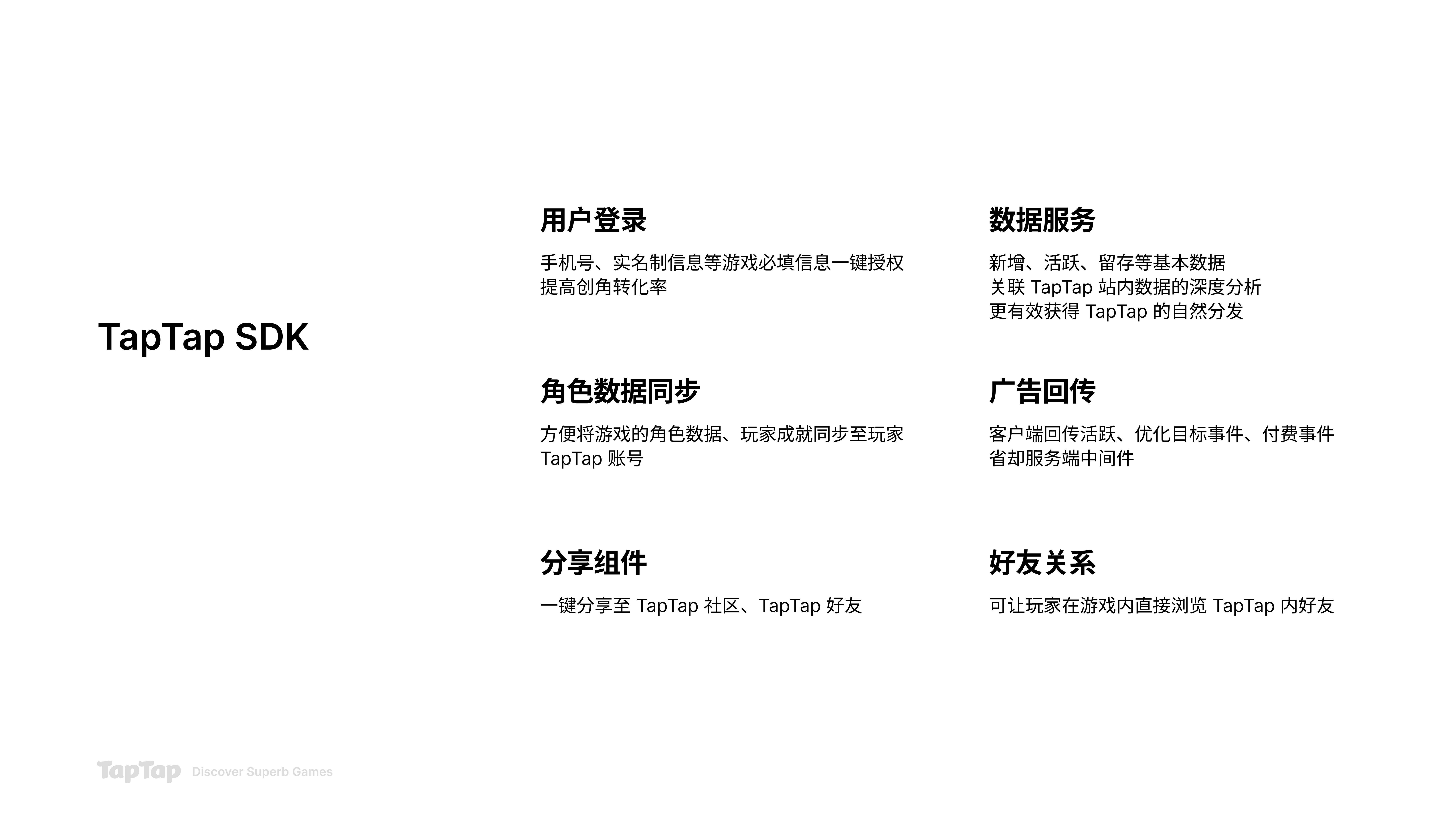 当然,聊到 SDK 开发者可能会警惕。当年 TapTap 推出时,我们喊的一个口号就是没有 SDK,我们不是渠道,不会强迫开发者接入 TDS, 这个初心没有变。而是我们希望把 TapTap 的账号价值真正沉淀下来,这不仅是 TapTap 有很大帮助,也将令所有开发者受益。