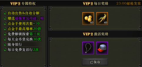 弄完月卡和成长基金之后就可以解锁VIP2,解锁自动出售和自动分解,更加方便挂机升级,每日免费复活2次。