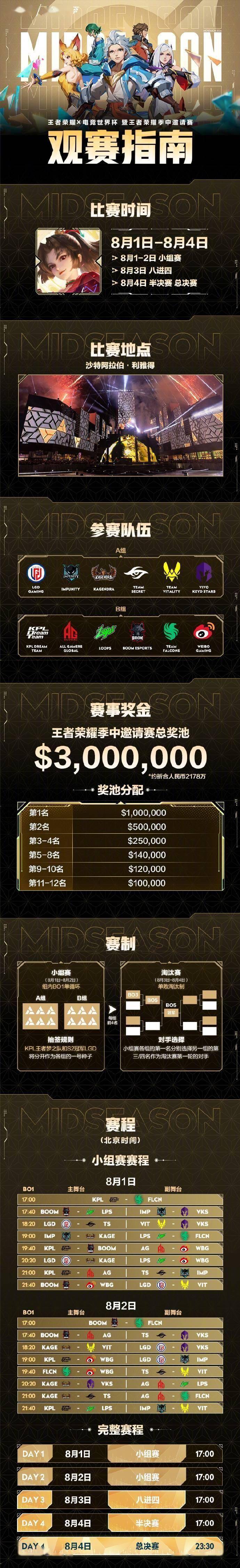 8 月 1 日消息,腾讯今日公布王者荣耀 x 电竞世界杯暨王者荣耀季中邀请赛观赛指南,比赛时间为 8 月 1 日-8 月 4 日,全球范围内的 12 支顶尖战队参赛,总计 300 万美元(备注:当前约 2167.3 万元人民币)赛事奖金。