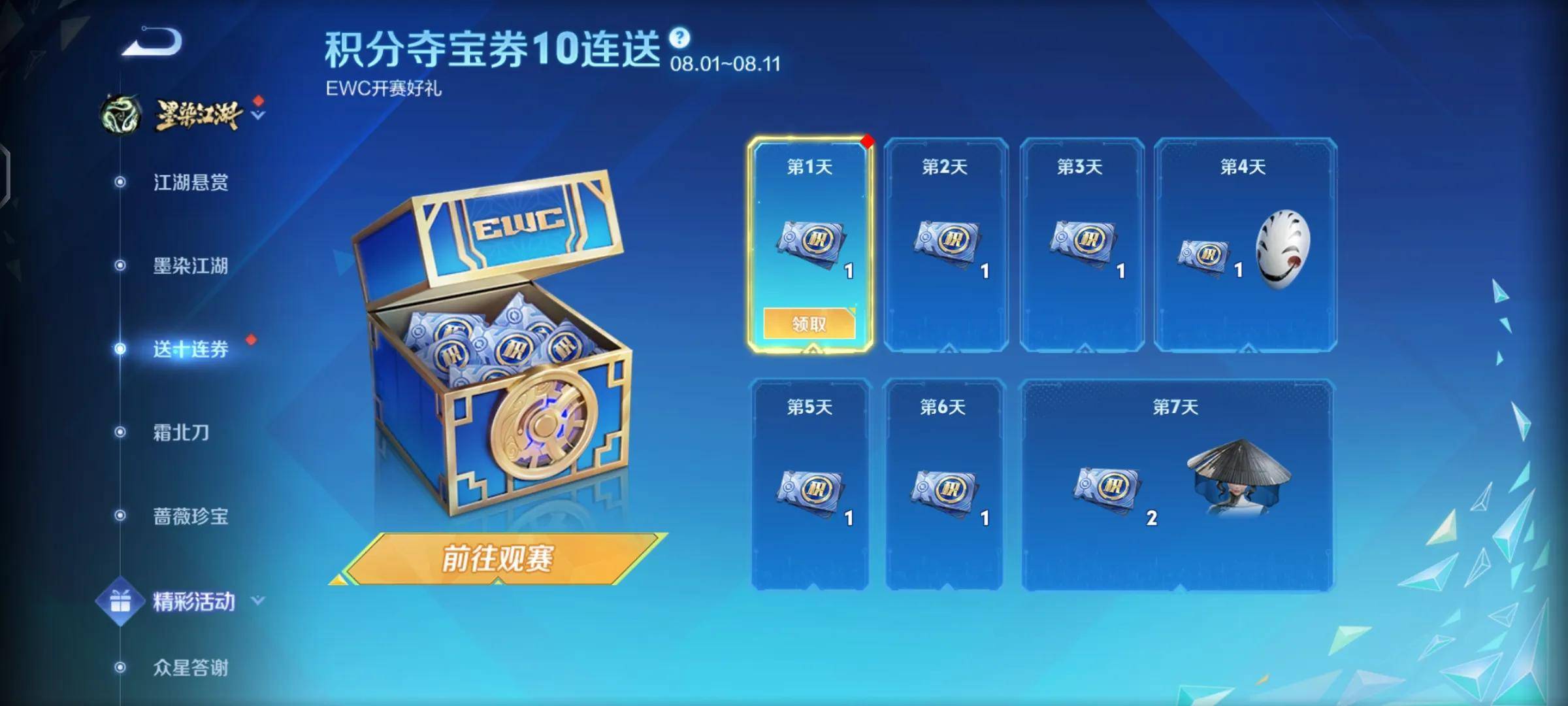 前面几天大家只需要登录完成一局游戏就能够拿到一张免费的积分夺宝券,而后面大家需要观看比赛才能够拿到积分夺宝券。
