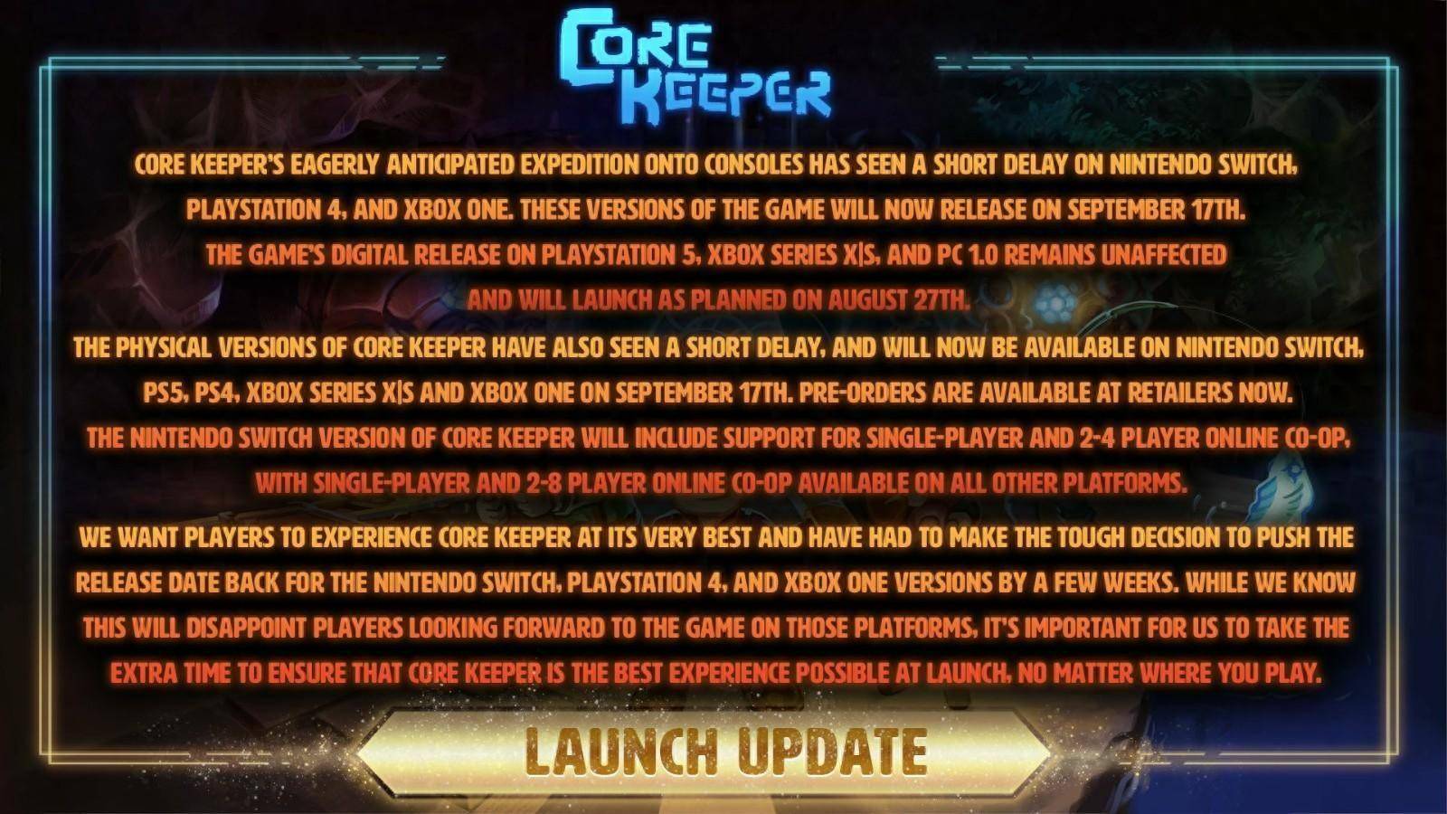 根据开发商Pugstorm Games在X上发布的声明公告,矿类沙盒冒险游戏《地心护核者》1.0正式版的PS4、Xbox One和Switch版将延期至9月17日发售,PS5、Xbox Series X|S和PC的数字版仍将按计划于8月27日发售。另外,所有平台的实体版也被延期到了9月17日。