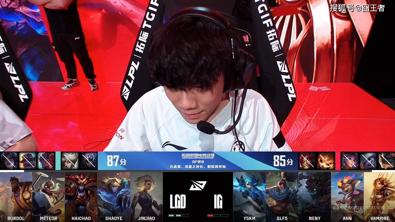 决胜局,IG蓝色方,禁用兰博、小炮、婕拉、奎桑提、纳尔,选用贾克斯、莉莉娅、亚索、德莱文、泰坦;LGD红色方,禁用卡莎、斯莫德、布隆、青钢影、永恩,选用波比、豹女、飞机、伊泽瑞尔、蕾欧娜