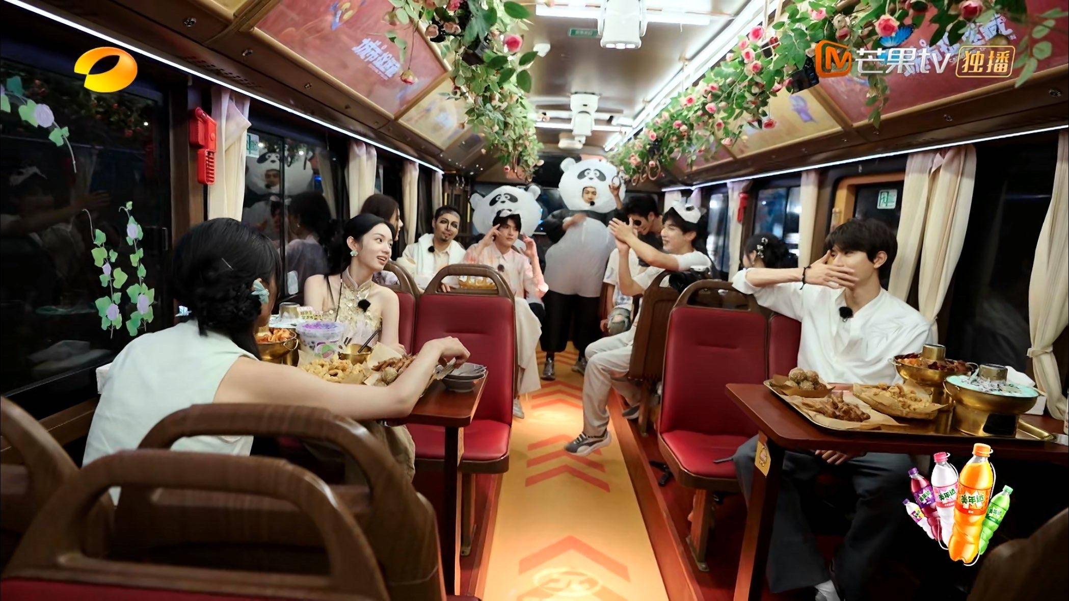 经过一场速度与激情的追逐战,玩家谢可寅成功成为“鼠王”,她带着同队的周也、林一,一起登上了极具成都特色的火锅巴士,一边欣赏城市夜景,一边感受火锅风味。其他人则装扮成各种熊猫造型,成为“鼠王”的随从,也一同在火锅巴士上享用美味。