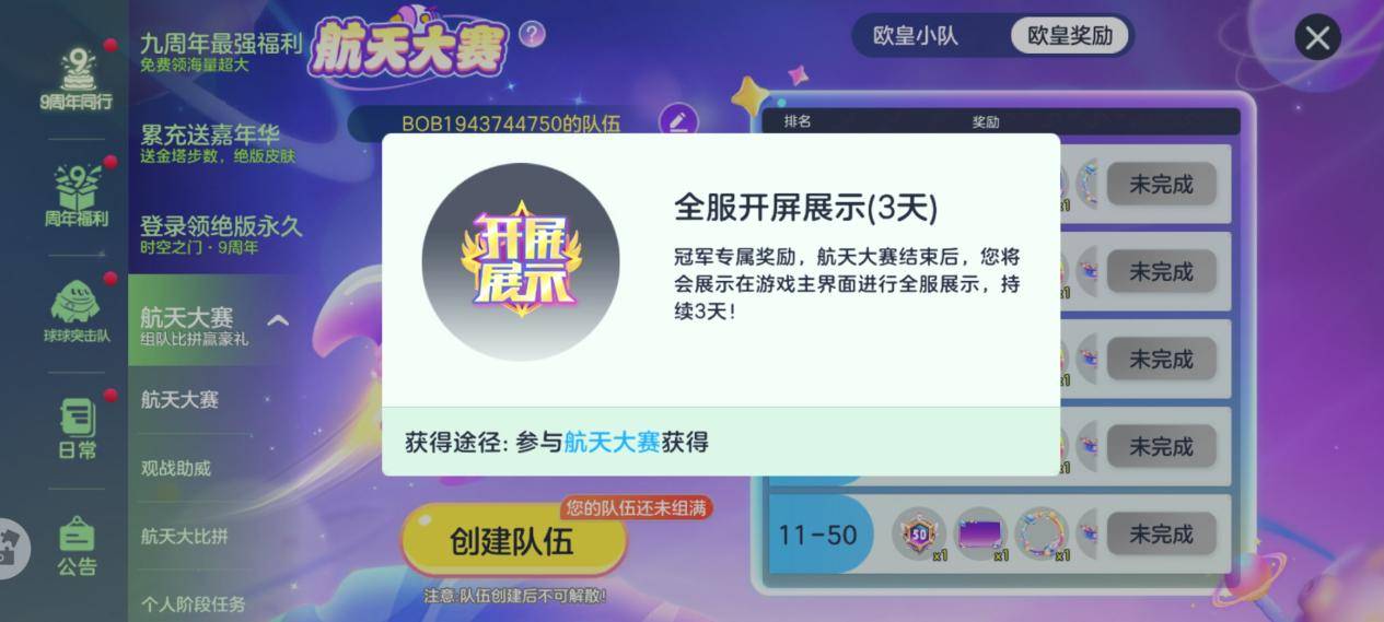 航天大赛是《球球大作战》九周年开启之后的首个组队活动,我们可以单独组成一队或者与最多两名玩家共同组成一支多人小队,在每天的四个时间段当中,系统会为我们开启随机匹配,你的对手会在游戏的PK界面出现,你们那将作为对手开启一轮爬塔PK,获得本场对局胜利的玩家将直接解锁海量金蘑菇奖励。和来自五湖四海的玩家一同合作对战,赢得丰厚的活动福利。