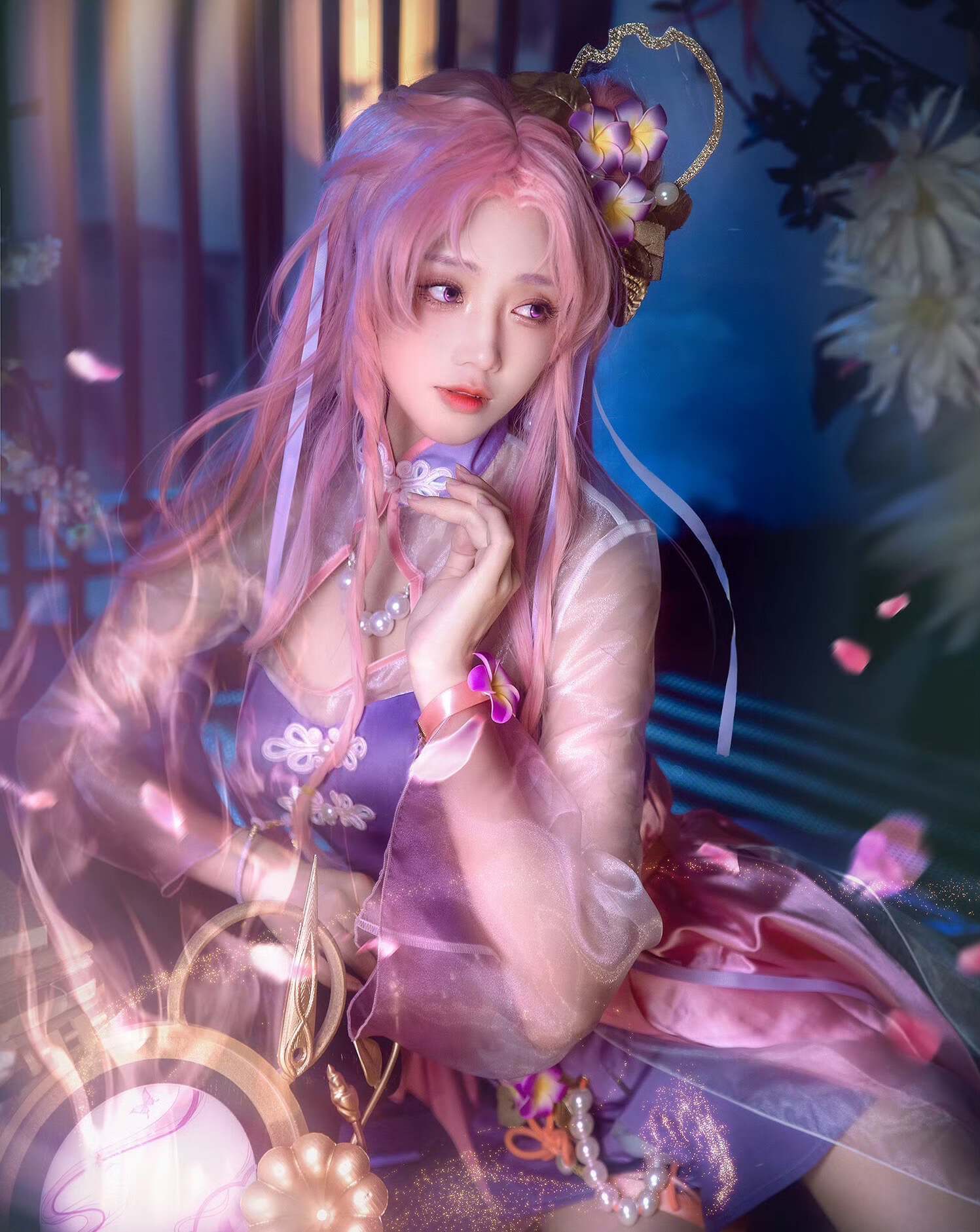 她也COS过王者荣耀中的很多个造型,比如我之前分享的杨玉环的COS造型。今天我们主要就来看一下她COS的王昭君乞巧织情。她COS的乞巧织情还原度可以达到100%,并且身上还有那种妩媚感,非常的绝。