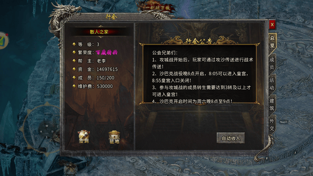 丰富的玩法和经典设定:保留了许多如攻沙、组队刷副本等经典的传奇玩法,让玩家能够重温当年的游戏回忆。此外,提供了战士、法师、道士三大经典职业供选择,每个职业都有独特的技能和定位,满足不同玩家的需求喜好。