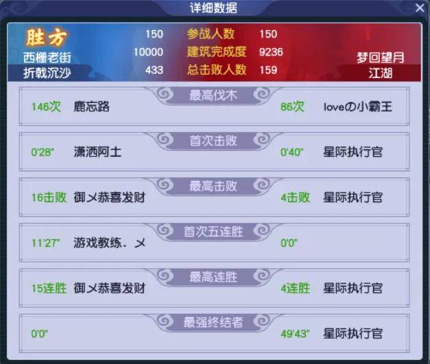 最终,【折戟沉沙】以10000:9236的建设差距和433:159的总击败人数差距,轻松拿下首局比赛。