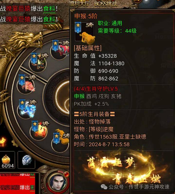 申猴、酉鸡、戌狗、亥猪4件生肖装备可激活PK加成比例属性。