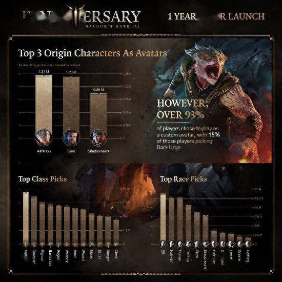 《博德之门3》于最近迎来了发售一周年,拉瑞安再次分享了趣味数据,部分数据如下: