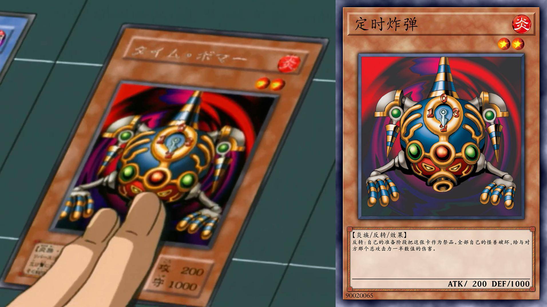 定时炸弹[怪兽|效果|反转]炎/炎[★2]200/1000。反转效果:自己的准备阶段把这张卡作为祭品。全部自己的怪兽破坏,给与对方那个总攻击力一半数值的伤害。