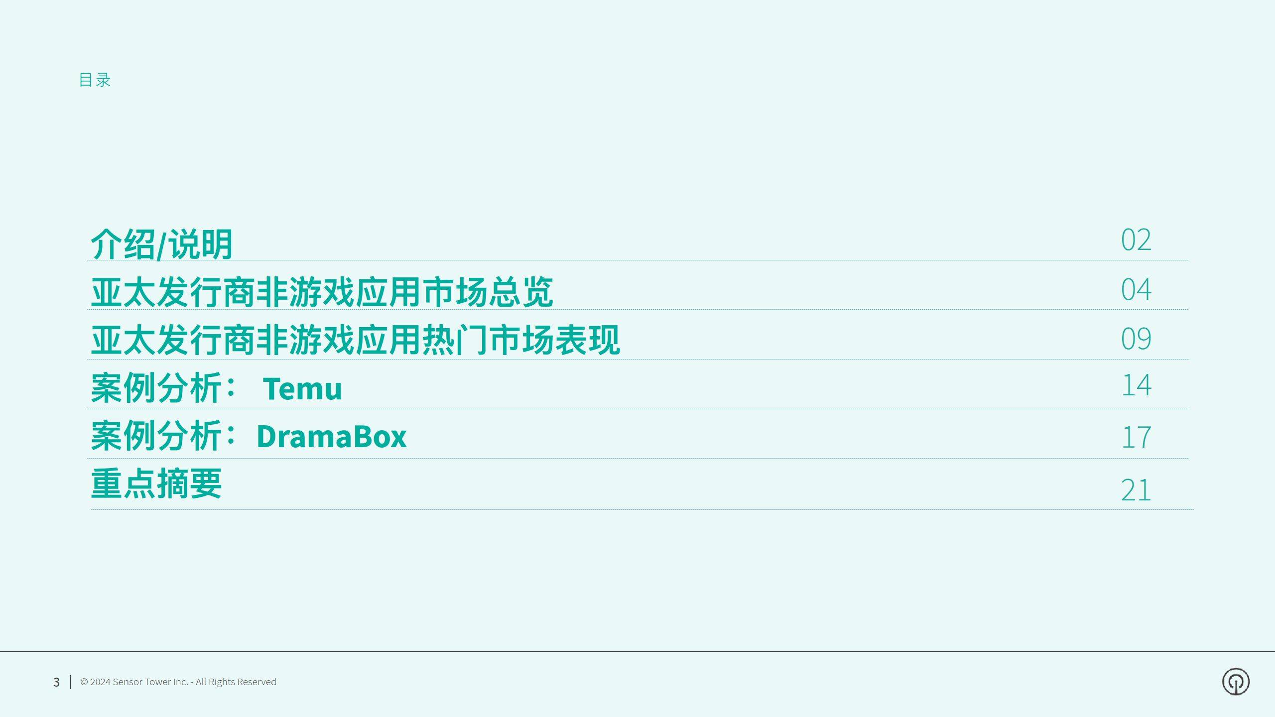 报告提供2024年关于App store和Google Play渠道亚太发行商非游戏应用在全球市场的深度分析。其中包括近年来头部亚太非游戏应用全球收入趋势,2024年头部亚太非游戏应用畅销榜、增长榜与下载榜,以及日本、韩国、东南亚和印度等市场亚太非游戏应用表现。报告同时提供经典案例分析,帮助读者了解热门非游戏应用《Temu》、《DramaBox》 的成功经验。