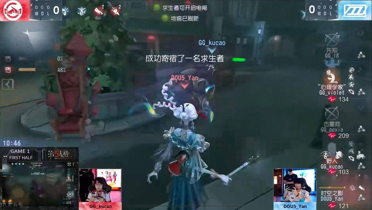 在第一局上半轮的比赛中DOU5_Yan选出时空之影,开局时空之影选择击倒先知,在野人两波救援后,先知被淘汰。随后时空之影选择控场,并将求生者逐个击破,完成四抓。下半轮的比赛中GG_xawm选出歌剧演员,前期歌剧演员将空军击倒淘汰,中期经过歌剧演员数次换追换挂后,双方进入开门战,随后歌剧演员击倒先知和佣兵,完成三抓。DOU5第一局率先取得优势。