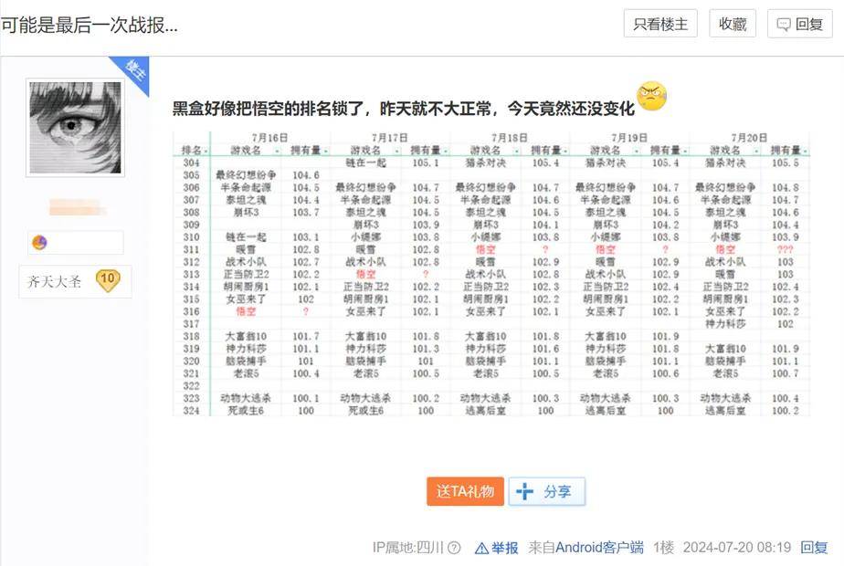 这并不是游戏科学与吧友的第一次交手。此前有吧友曝出,旧版小黑盒能够显示《黑神话》的拥有量,而消息放出的当天,小黑盒就对这一Bug进行了修复。但博弈并不会就因此而停下来,聪明的吧友乘机爬虫了黑神话前后产品的数据,此后就可以从一个大致区间推算出黑神话的保底销量,结果这种方法也被小黑盒发现进行了锁定,可谓魔高一尺道高一丈。