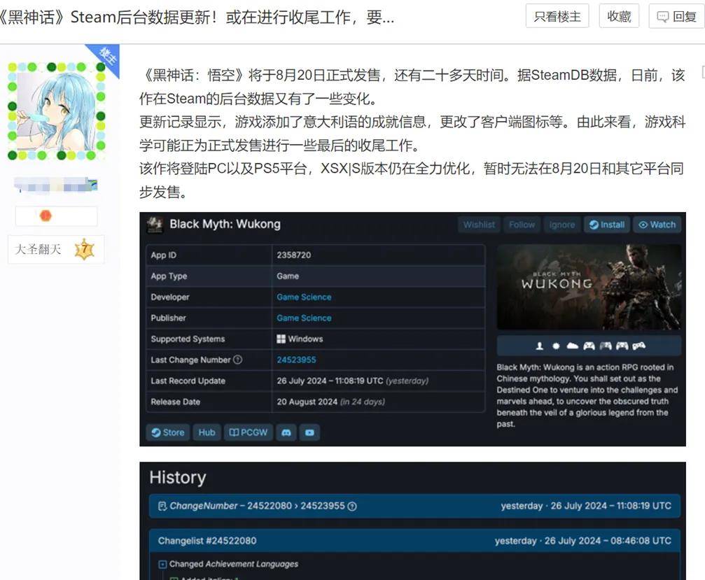 直到当天上午10点,游戏科学正式发布了预告的预告,表示将在8月8日发布新PV,全网欢呼雀跃的同时,另一边吧友凌晨时分的猜想也得到了证实:游科的确是紧急撤回了提前发布的设置。