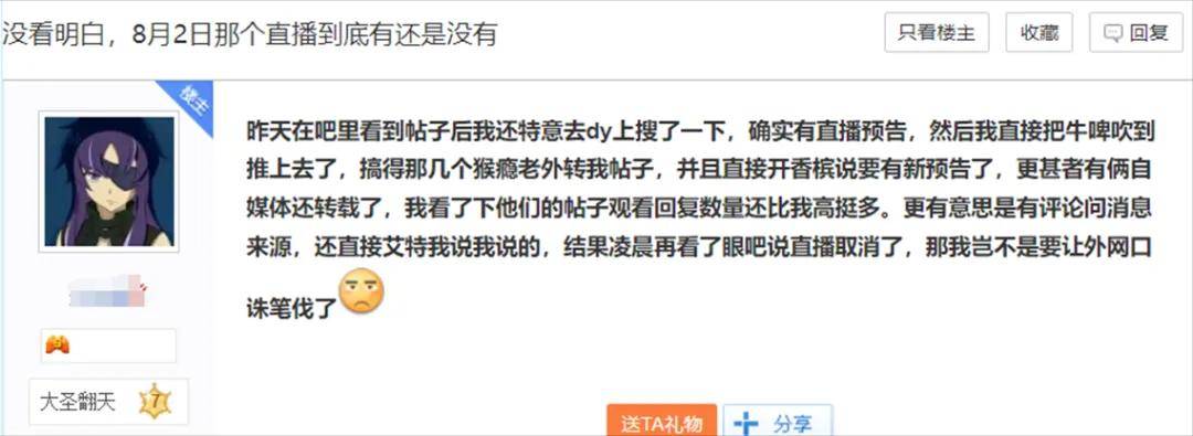 再比如7月中旬的时候,黑神话抖音官方账号发布了直播预告,宣布将于8月2日晚上8点开启直播。结果到点后游戏科学并没有什么动静,上演了一出 「烽火戏诸猴」,不少吧友表示,游科肯定被吓着了,临时取消了直播。