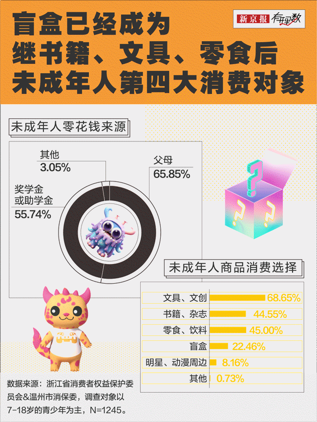 据浙江消费者权益保护委员会和温州消保委联合发起的未成年人消费观调查,盲盒已经成为未成年人仅次于书籍、文具以及零食饮料的消费选择。