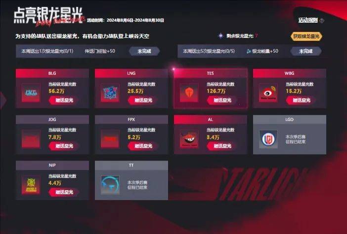 LOL官方推出了LPL夏季赛季后赛战队的助威活动,“点亮银龙星光”,截止发稿前TES已经收获126.7万星光,第二名BLG银龙星光56.2万。