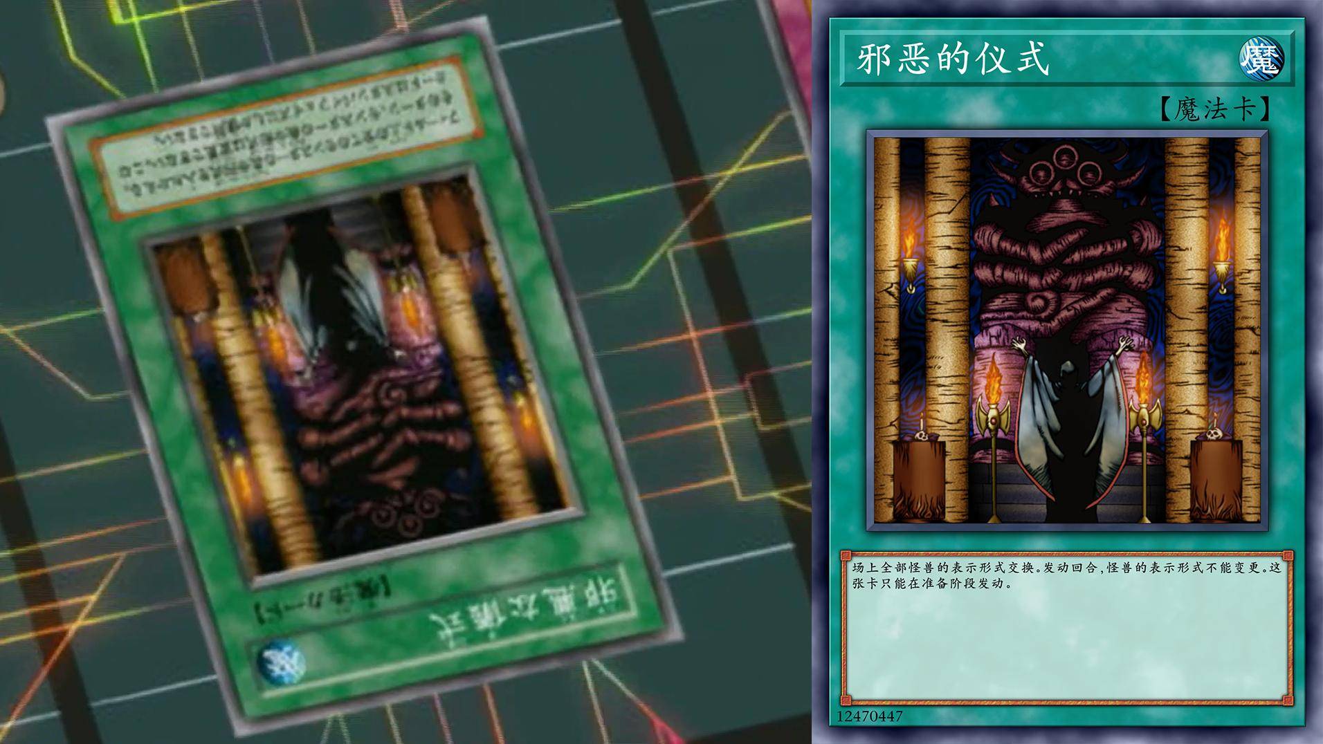 邪恶的仪式[魔法|通常]。效果:场上全部怪兽的表示形式交换。发动回合,怪兽的表示形式不能变更。这张卡只能在准备阶段发动。