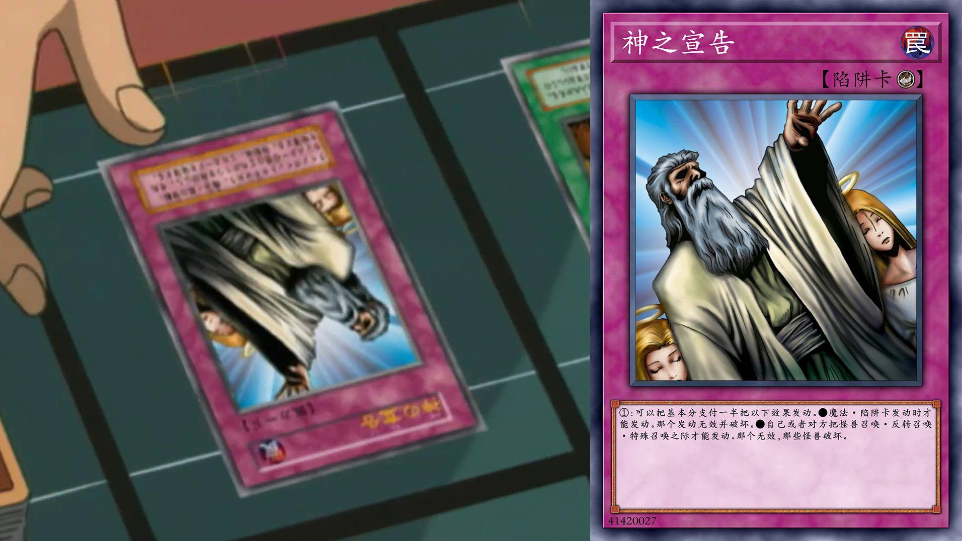 神之宣告[陷阱|反击]。效果:可以把基本分支付一半把以下效果发动。●魔法·陷阱卡发动时才能发动。那个发动无效并破坏。●自己或对方把怪兽召唤·反转召唤·特殊召唤之际才能发动。那个无效,那些怪兽破坏。