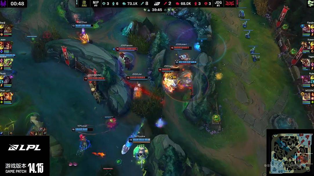 我们常常说Kanavi是JDG核心,但sara不觉得他真的擅长野核,尤其是AP野核。他更喜欢节奏战士打野,在吃到大量资源的情况下,能够更容易做事情。但这个版本的AP打野操作上限不高,除了莉莉娅和奈德丽,其他主流AP打野都缺乏机动性,婕拉、卡尔萨斯和布兰德这种英雄,本质上就是控图支援的刷子。对阵NIP五放婕拉不是问题,Leyan的奈德丽和布兰德也不差。