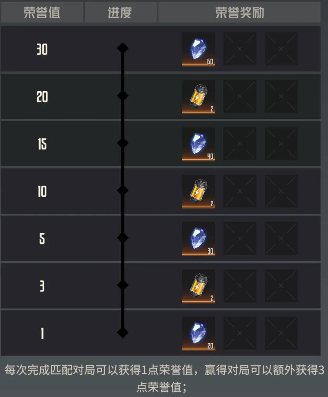 首先是完成固定的匹配荣誉值即可获取部分奖励,总计最高获得30点荣誉值可以拿到150钻石和6个体力能源的奖励。