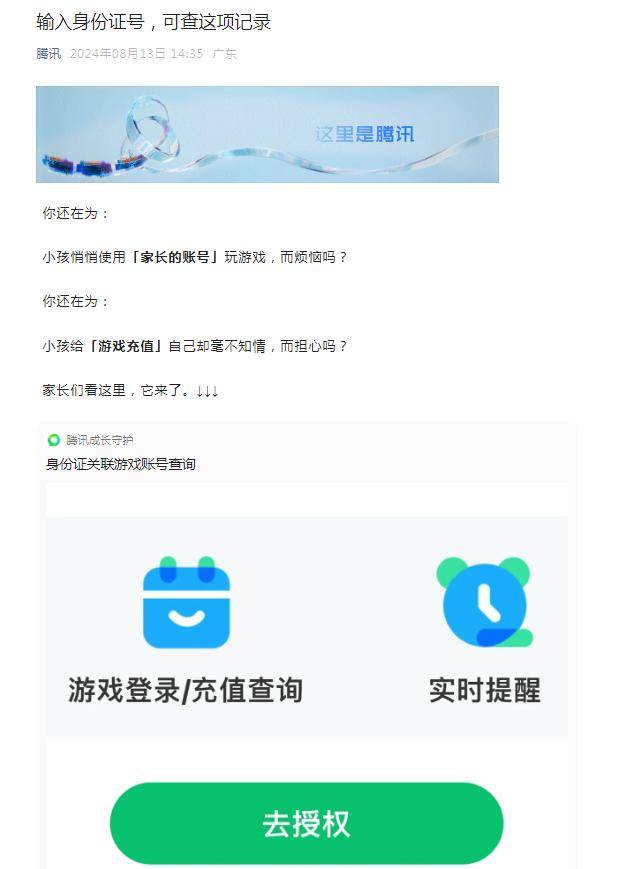 8月13日午间,腾讯发布身份证关联游戏账号查询新功能,孩子使用家长的账号玩游戏、充值,都可以即时查询。