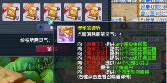 简单来说,玩家可以通过灵兽绘卷买到自己想要的召唤兽宝宝。需要先花费500w梦幻币在NPC处领取画笔,再挑选想要的宝宝来领取对应的绘卷任务。例如这个绘卷任务,对应的宝宝是博学的持国,拥有神佑,高再生,须弥,大雷。在上交完绘卷要求的道具后,即可将这只4技能持国收入囊中!